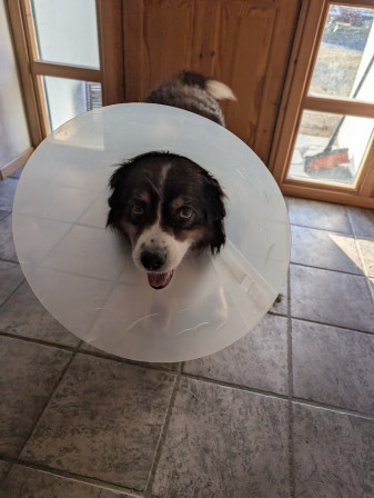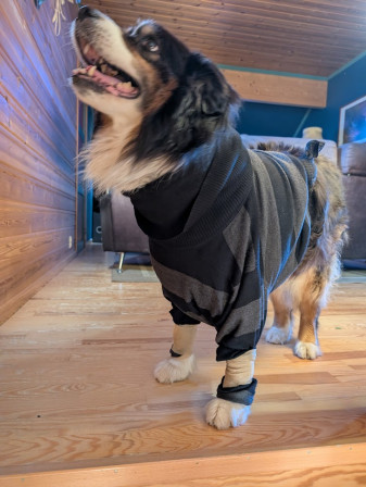 When the vet took a bloodtest of Aro, he shaved a small patch of fur of his right front leg to do so. Of Aro's front leg, that is. The vet was fine as he was. The bare patch has annoyed Aro to no end, and he went in t a licking fenzy. Not only did he lick so much that more fur disappeared and the bare area became bigger. He also licked through the skin and got a small infection. We have tried all sorts of things to protect the spot, hoping to avoid the cone of shame. The most successful attempt was dressing him in my sweater.